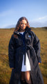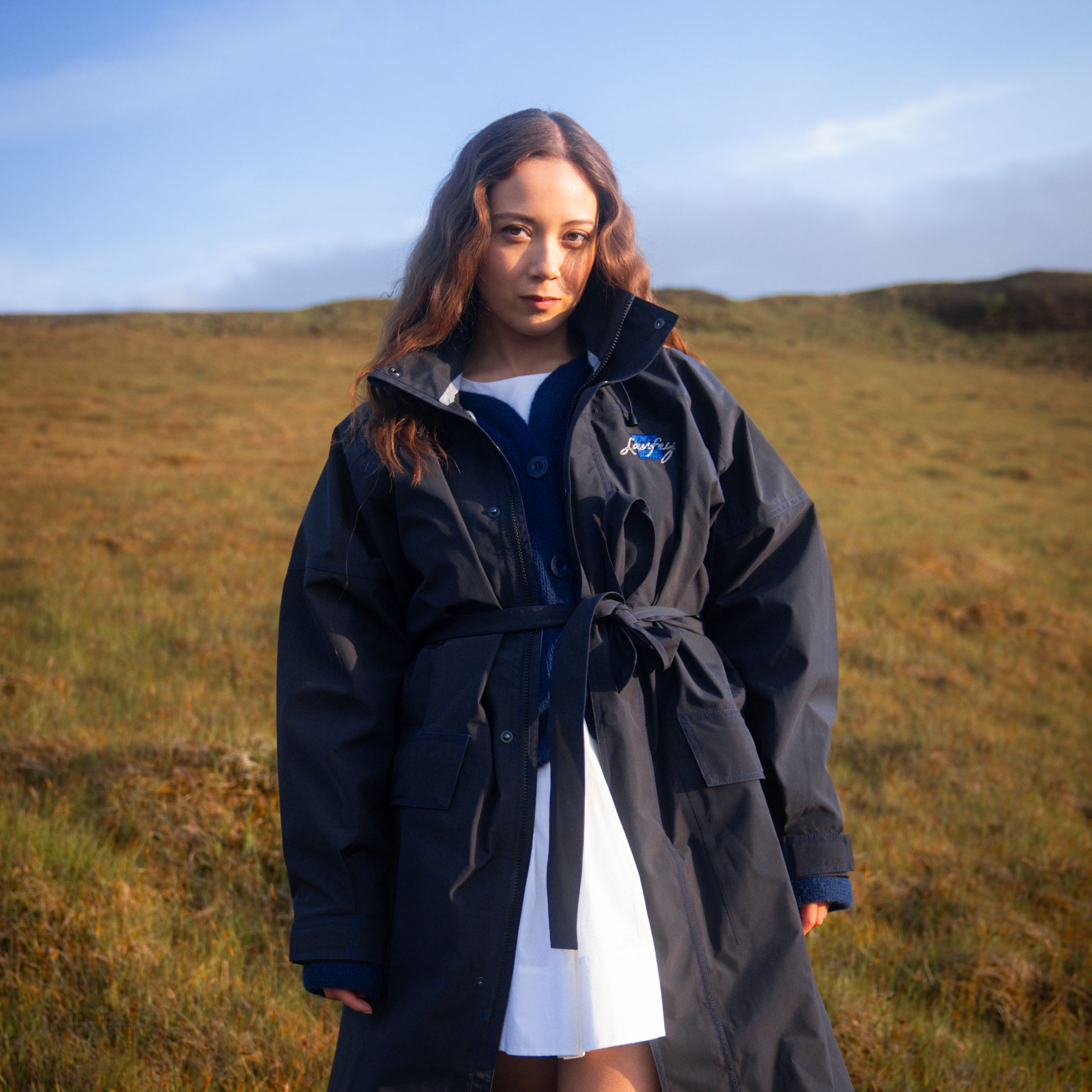 Kápan er gerð úr þriggja laga efni með 10.000 mm vatnsheldni sem þolir létta úrkomu. Hún er með stillanlegu mittisbelti og hettu úr Polartec® NeoShell® efni sem hægt er að pakka í kragann. Á kápunni eru tveir hliðarvasar, smellur meðfram rennilás og samstarfslógó 66°Norður og Laufeyjar.