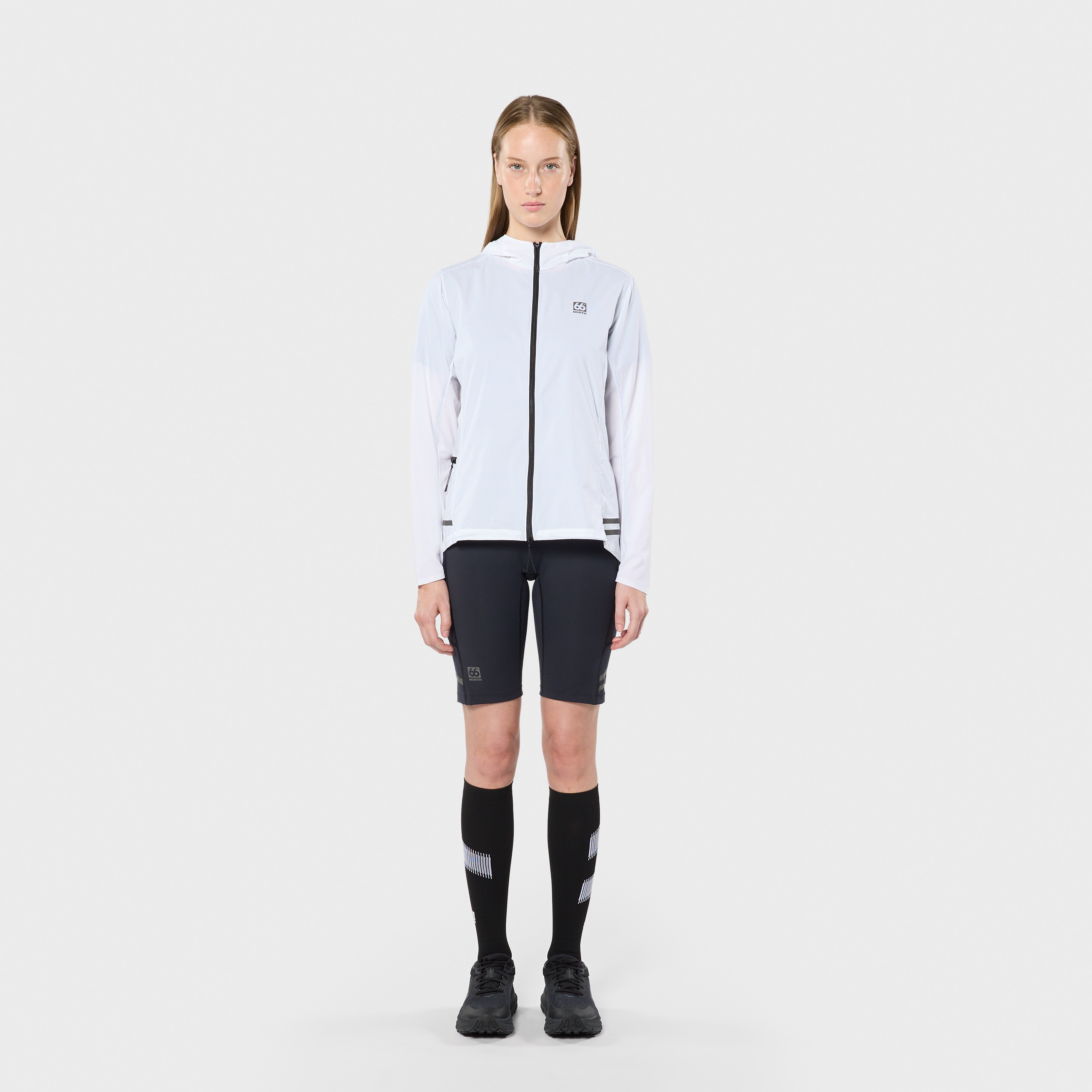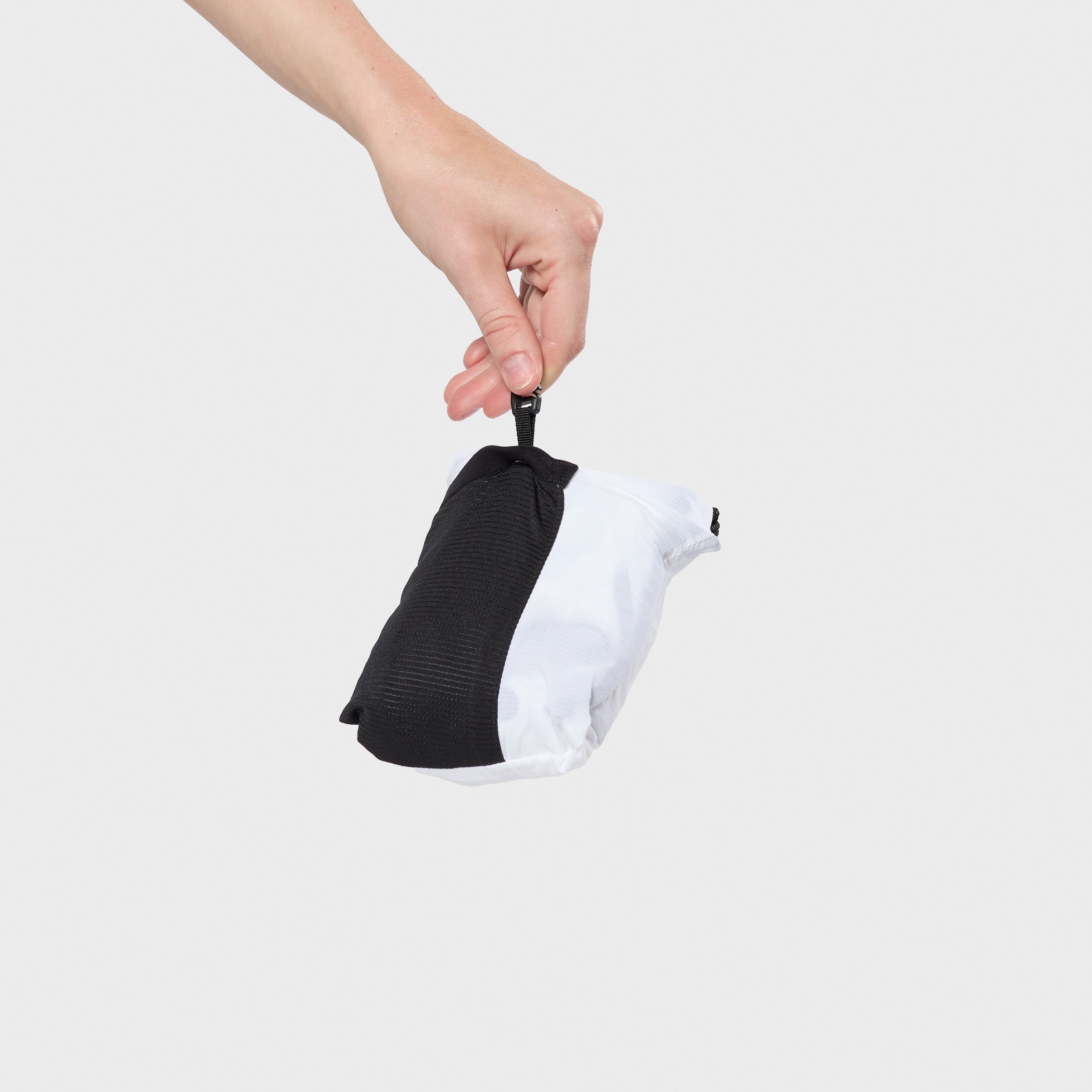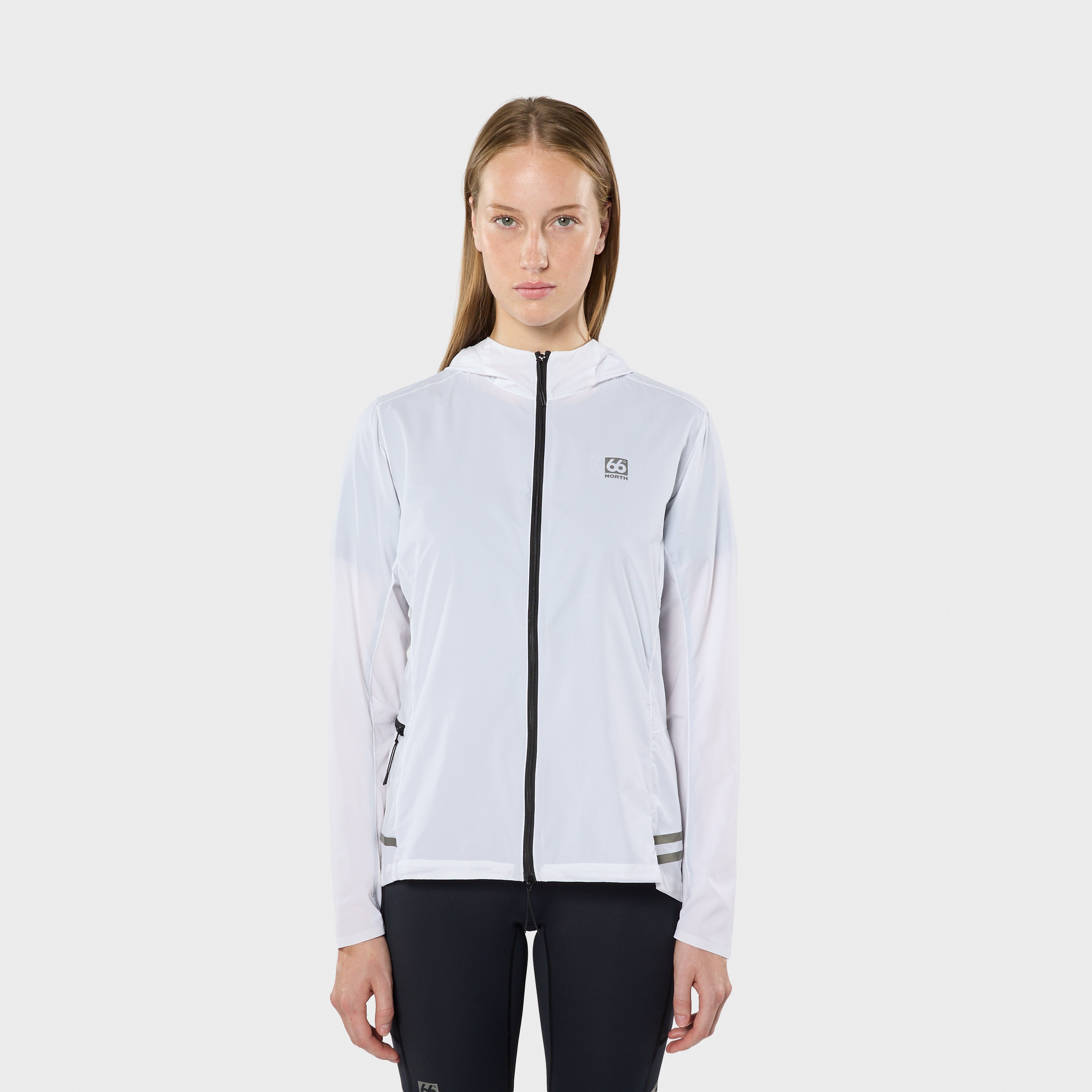 Á hliðinni er renndur vasi með krók fyrir lyklakippu. Einnig er hægt að pakka jakkanum saman í vasann svo hann taki mjög lítið pláss og má þá auðveldlega koma honum fyrir í vasa á stuttbuxum eða vesti, jafnvel án þess að stoppa.