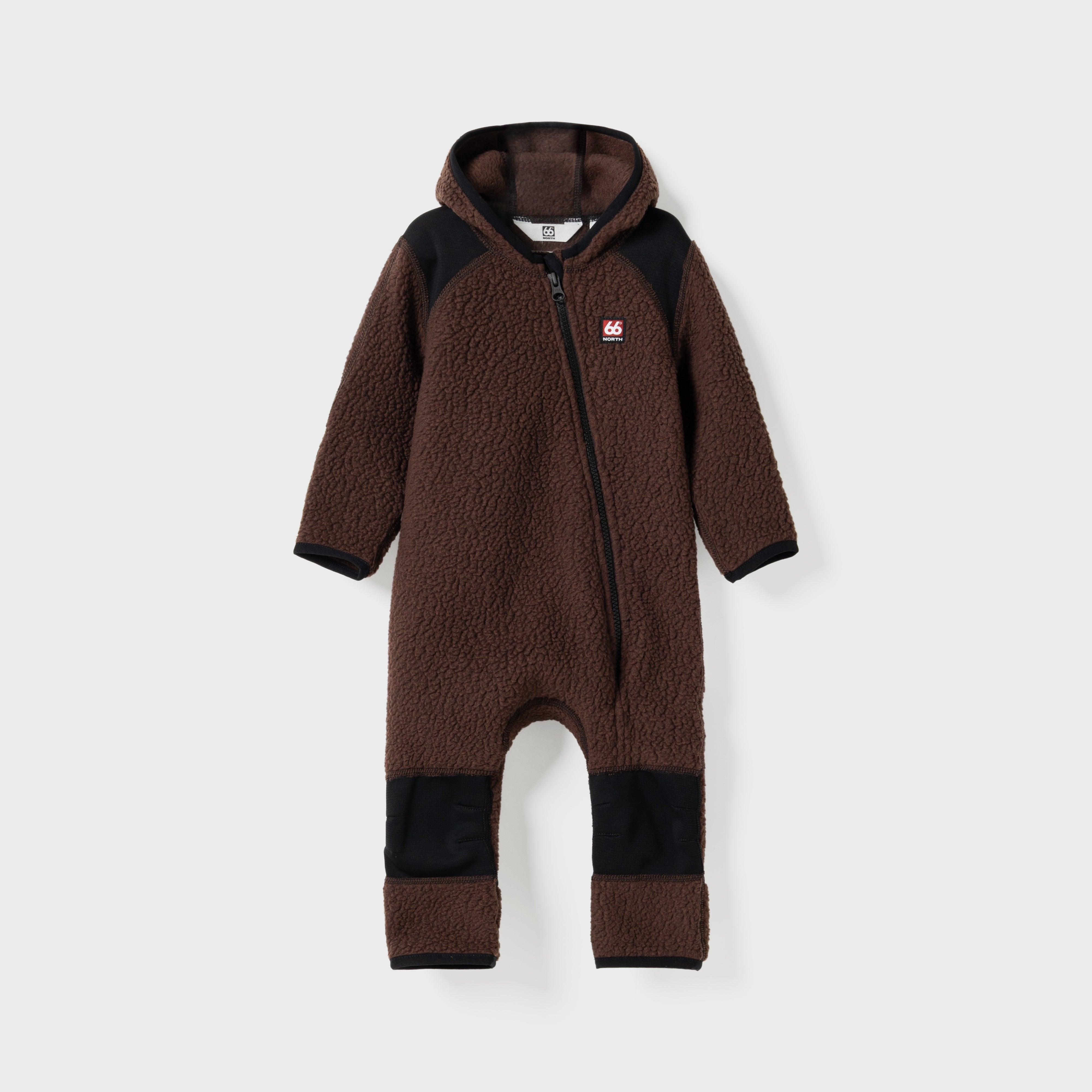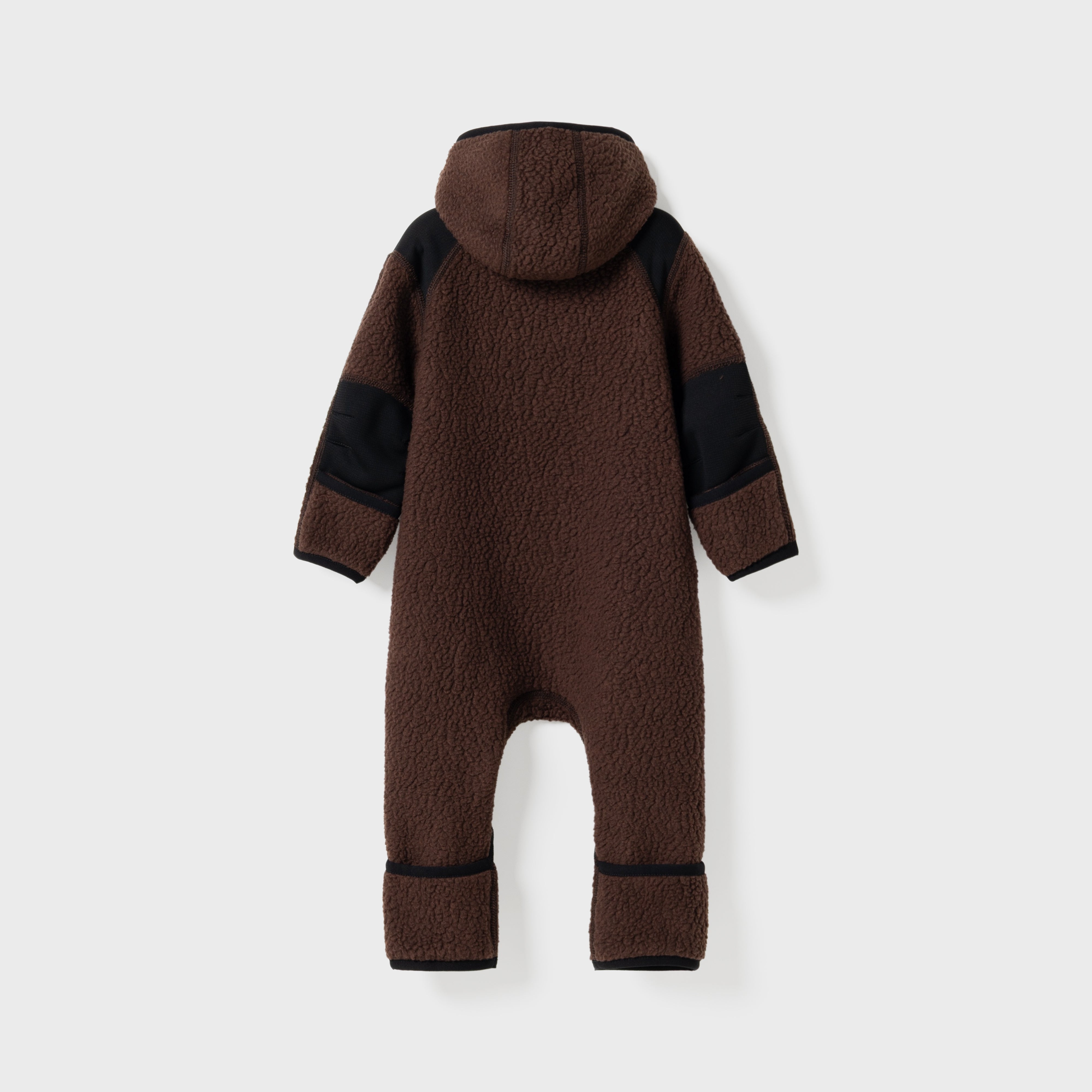 Mjúkur og þægilegur krulluflísgalli á ungbörn. Hægt er að loka fyrir hendur og fætur og áföst hetta. Efni: 100% Polyester.