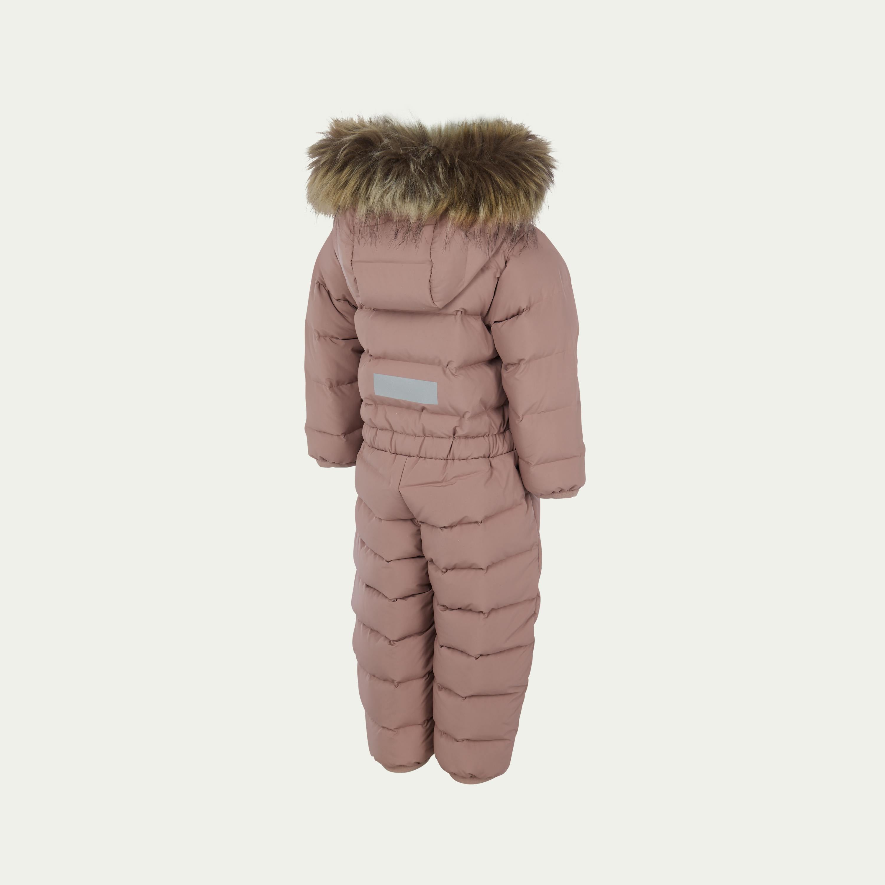 Léttur en mjög hlýr dún heilgalli á yngstu börnin. Gervi loðkragi á hettu sem hægt er að smella af. Vatnsfráhrindandi efni. Tveir rennilásar sem gerir það auðveldara að klæða barnið í og úr gallanum. Einangrun: 90% gæsadúnn og 10% fjaðrir. Efni: 100% Polyester.