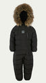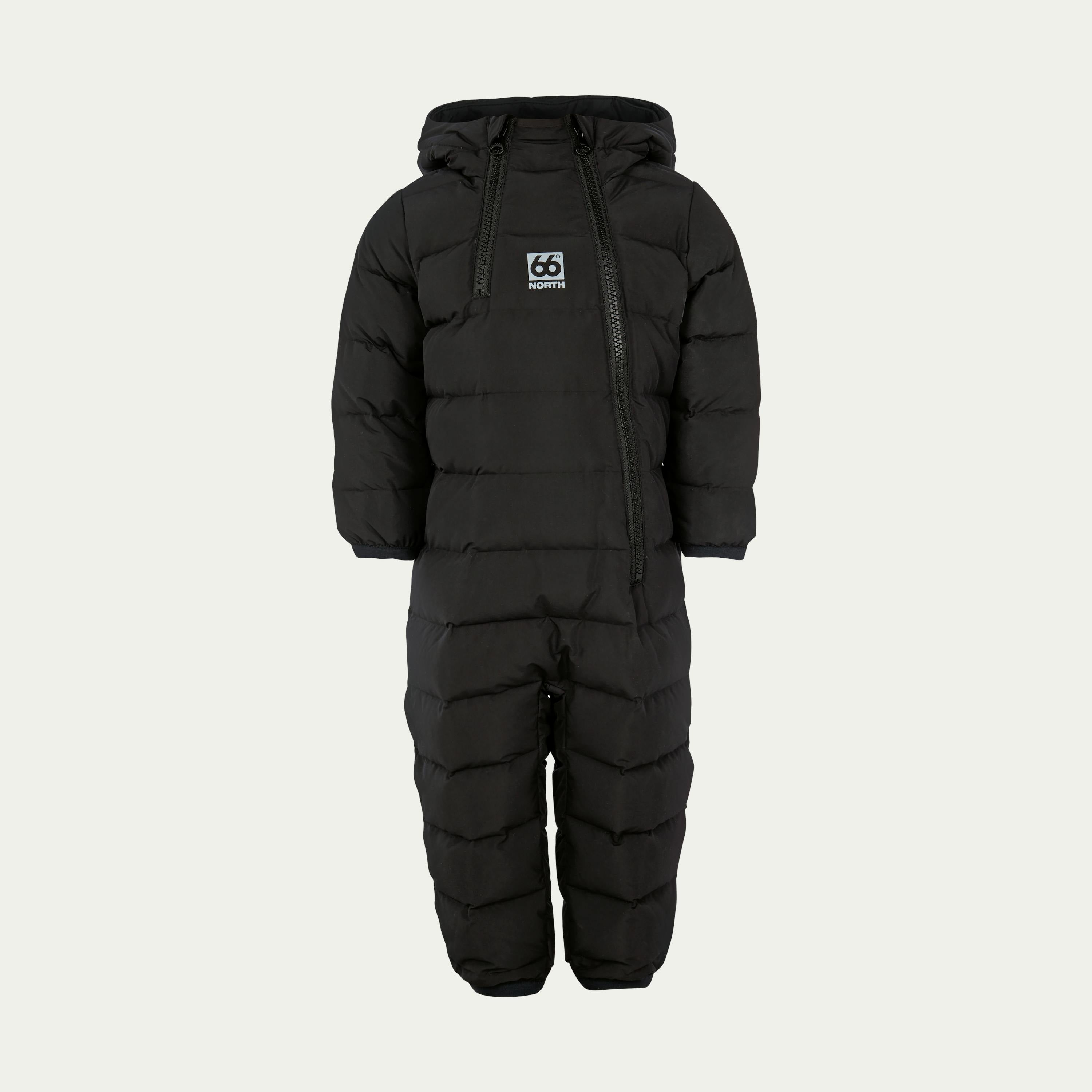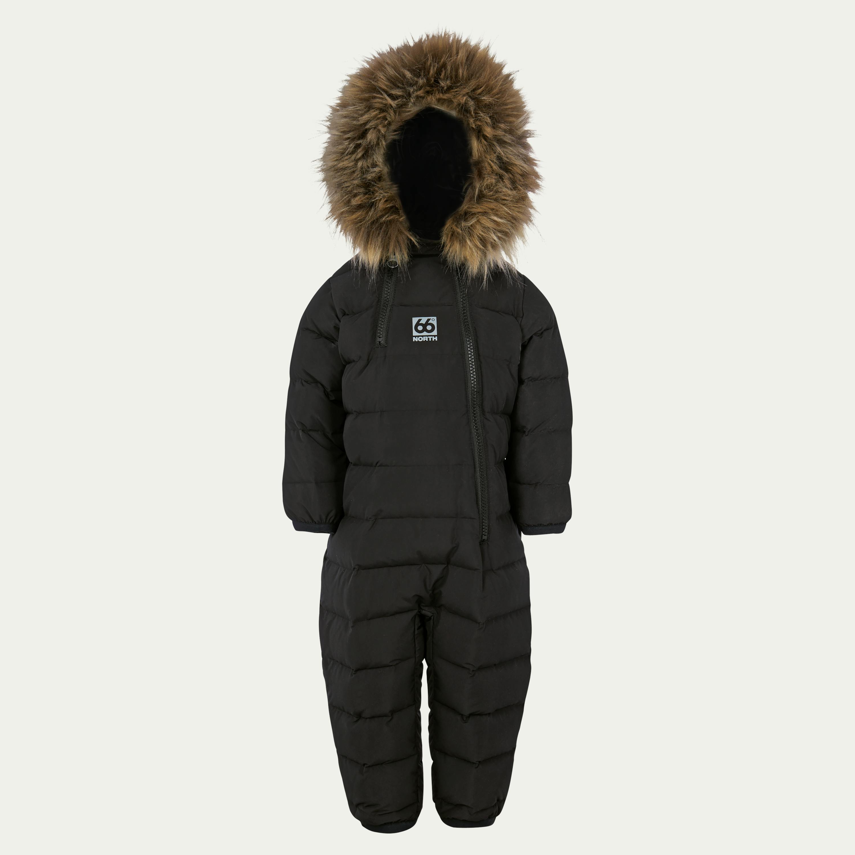 Léttur en mjög hlýr dún heilgalli á yngstu börnin. Gervi loðkragi á hettu sem hægt er að smella af. Vatnsfráhrindandi efni. Tveir rennilásar sem gerir það auðveldara að klæða barnið í og úr gallanum. Einangrun: 90% gæsadúnn og 10% fjaðrir. Efni: 100% Polyester.