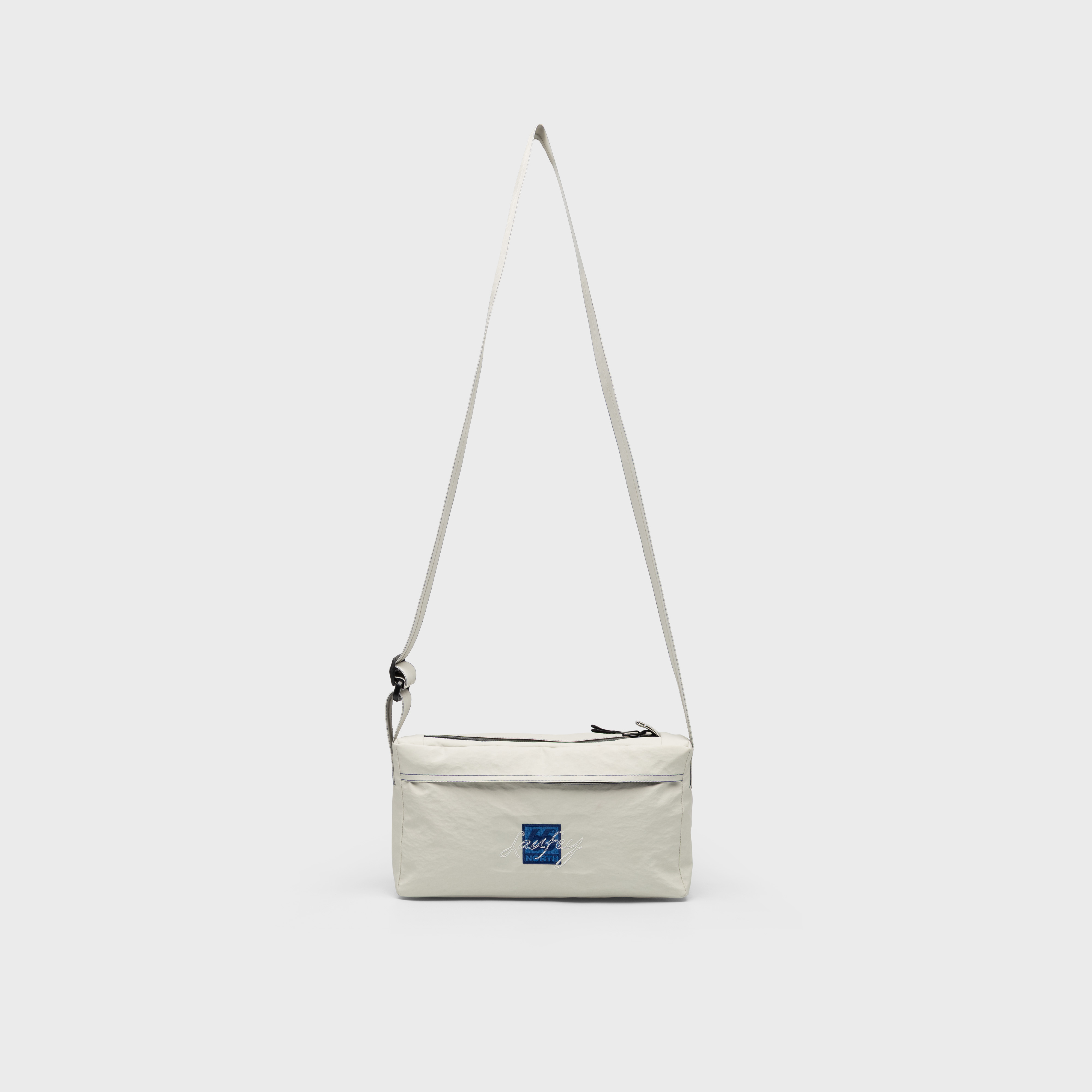 This shell bag is crafted from a three-layer fabric with a 10,000 mm waterproof rating, which can withstand light rain. It features the signature collaboration logo incorporating Laufey’s handwriting. The exterior is designed with a flap and a concealed zip pocket underneath. An adjustable strap allows it to be worn crossbody or styled as a shoulder bag.