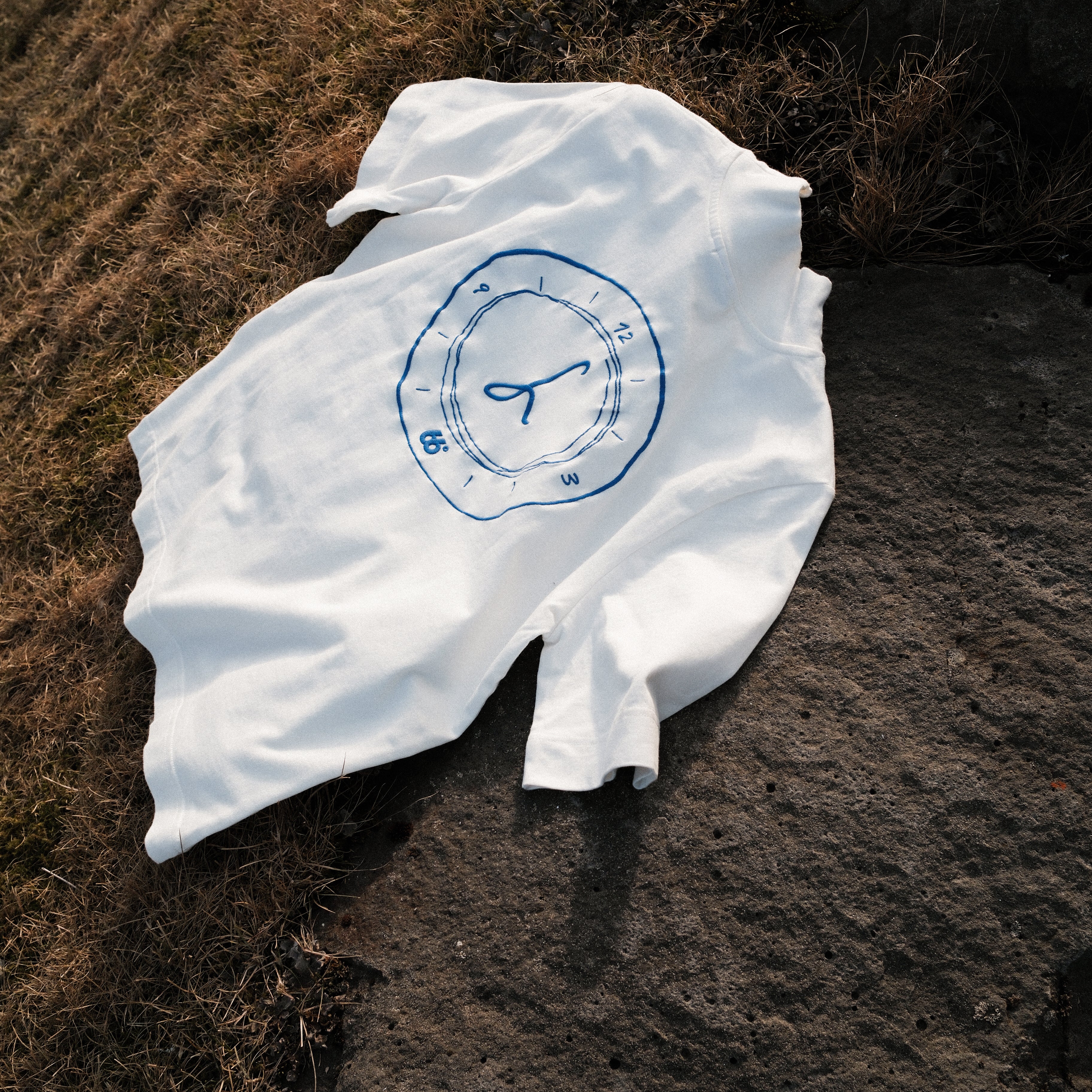 This T-shirt is a slightly fitted mock-neck shirt featuring the signature collaboration logo on the chest and a clock-inspired graphic on the back referencing Laufey’s stadium world tour, with her handwritten “L” at the center.