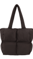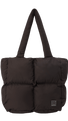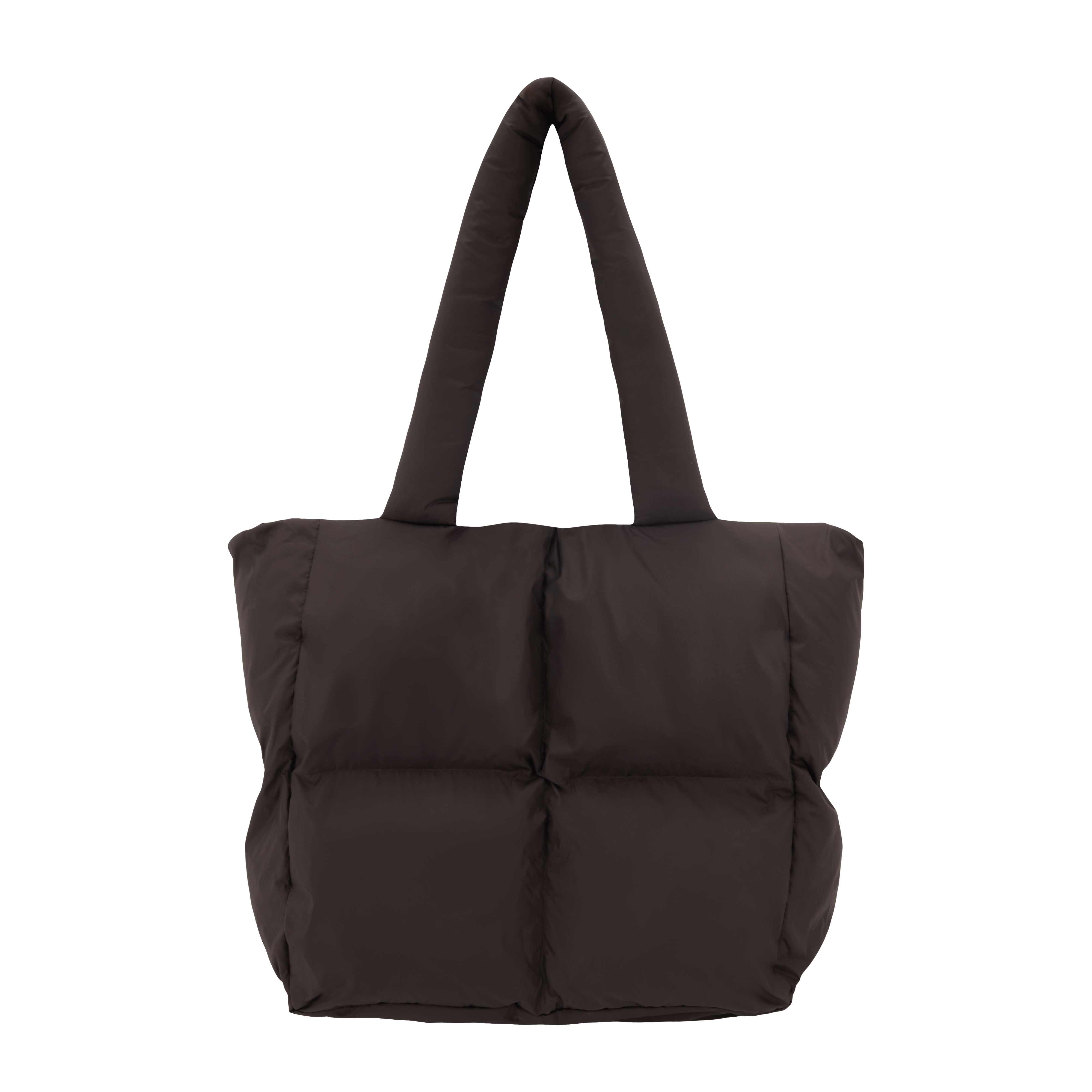 This lightweight puffy tote bag is filled with Thermore Genius, giving it a down-like feel. The bag features a snap closure and double handles, along with zipped inner pockets. A reflective pendant is attached to the handle. This bag is perfect for everyday use and completes the look when paired with a down jacket or coat.