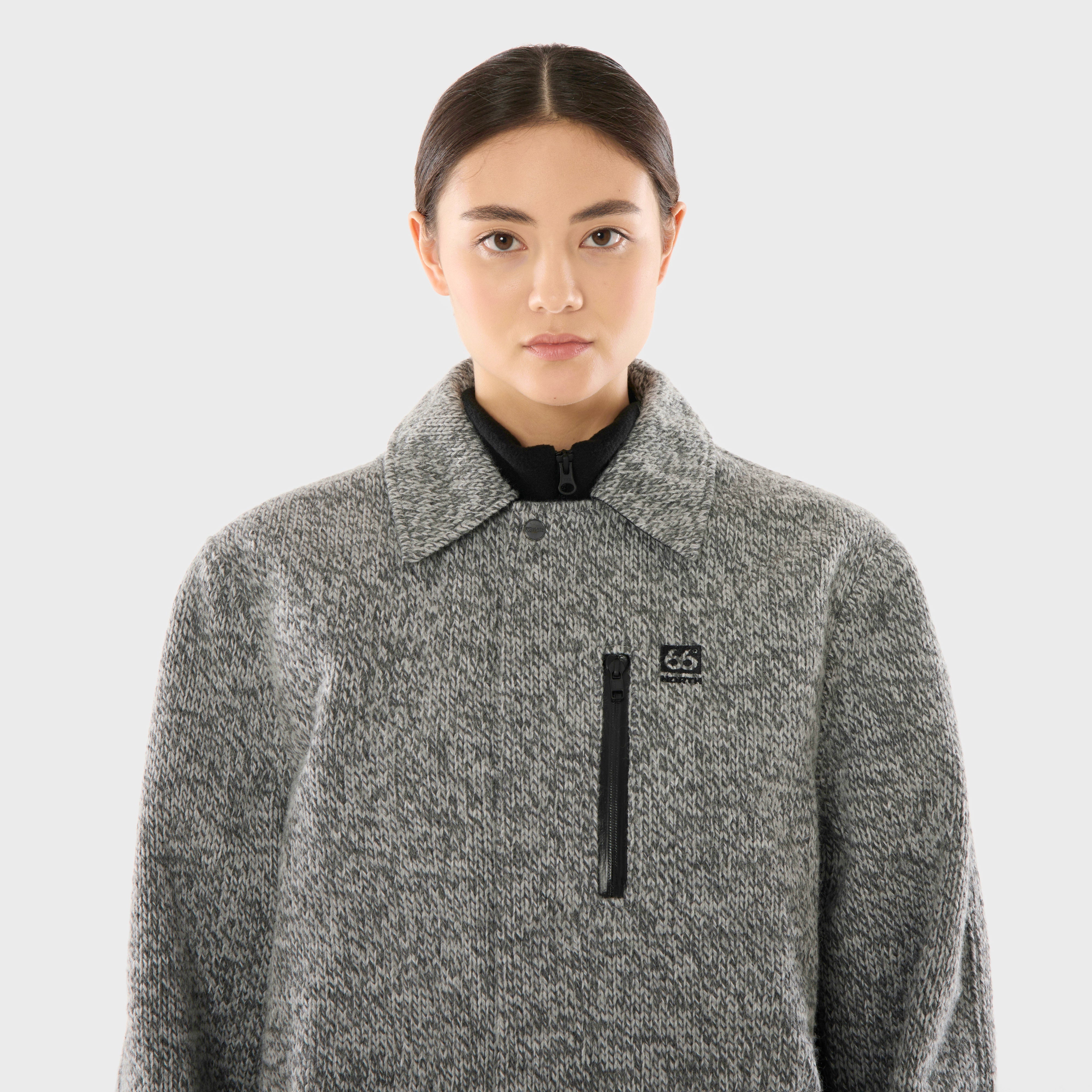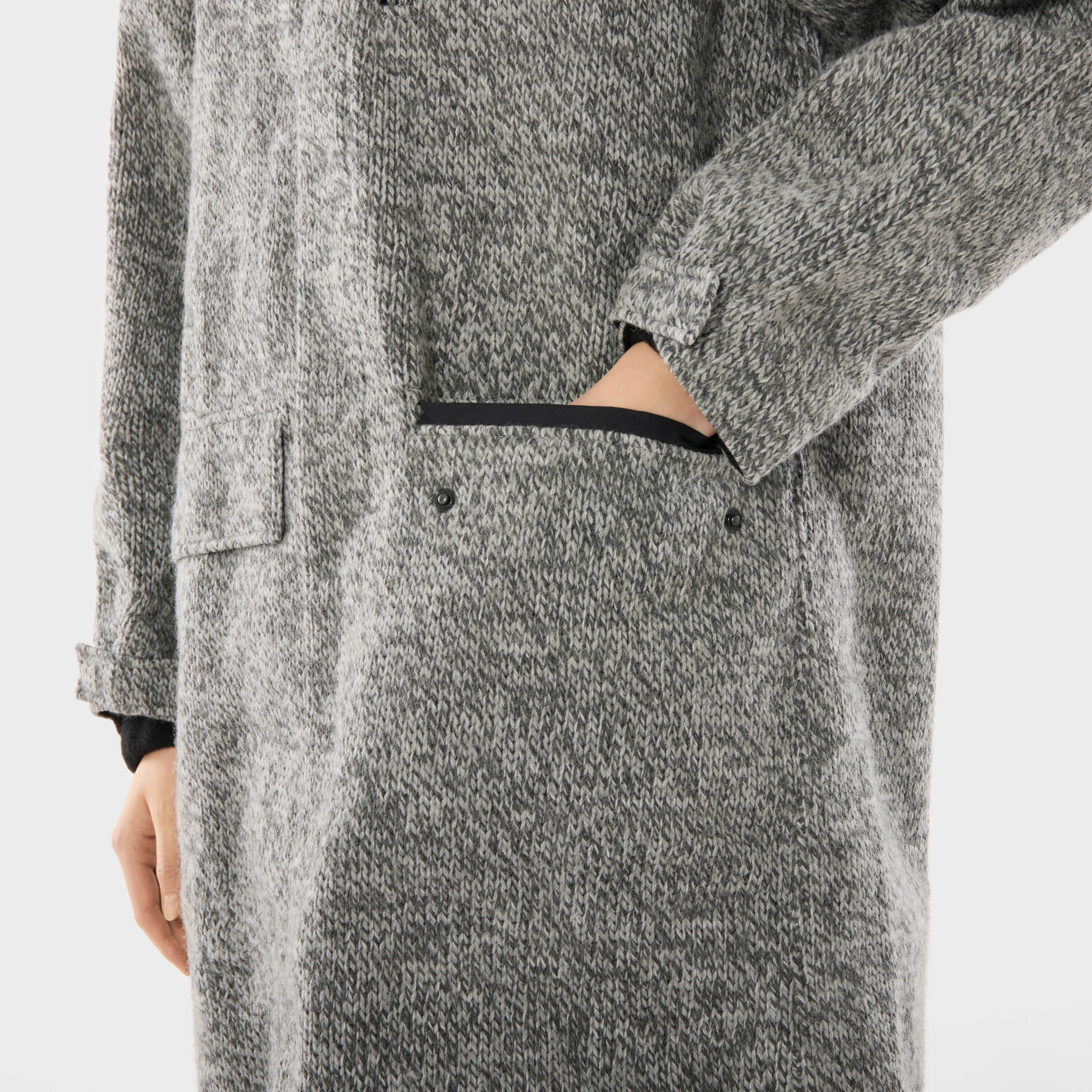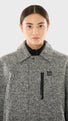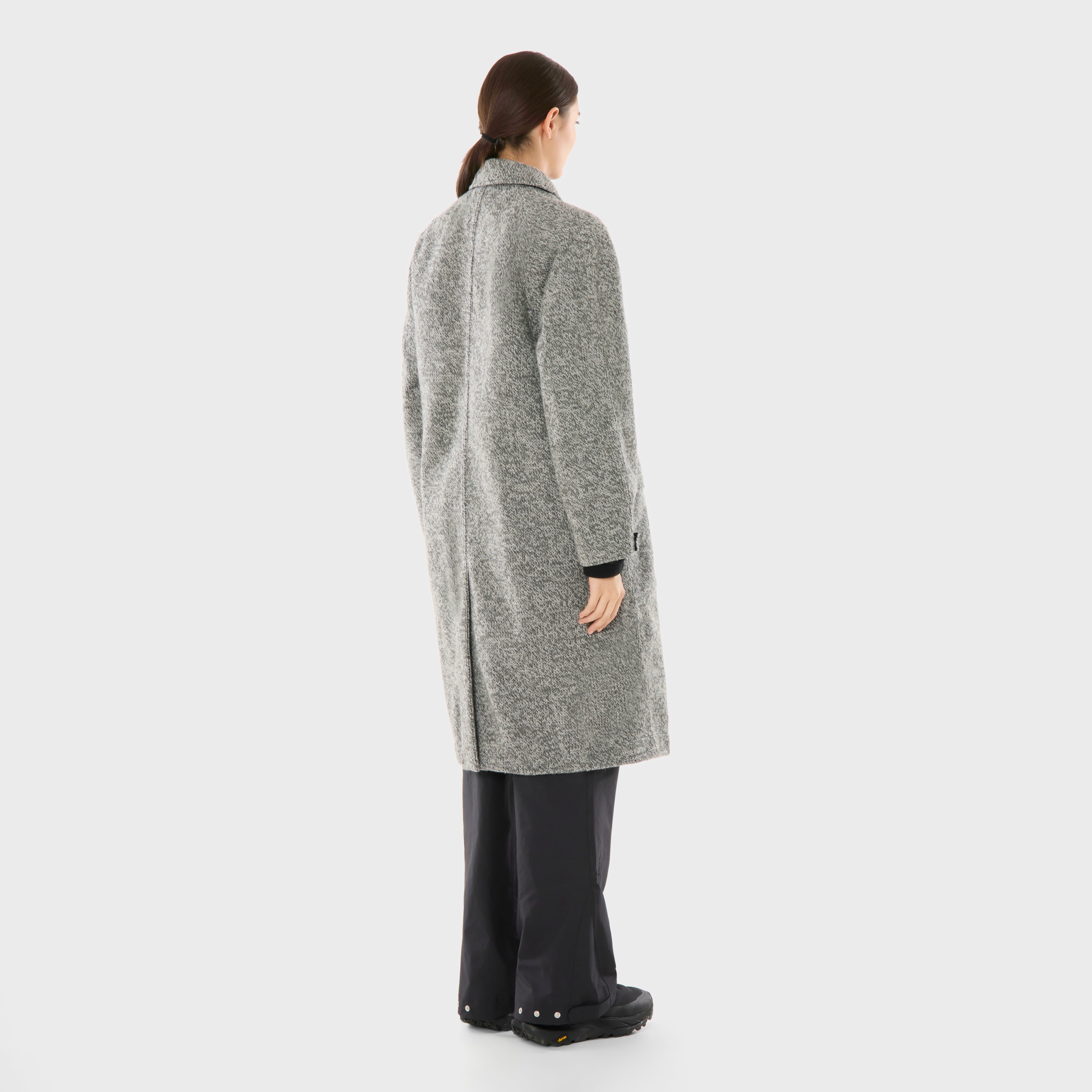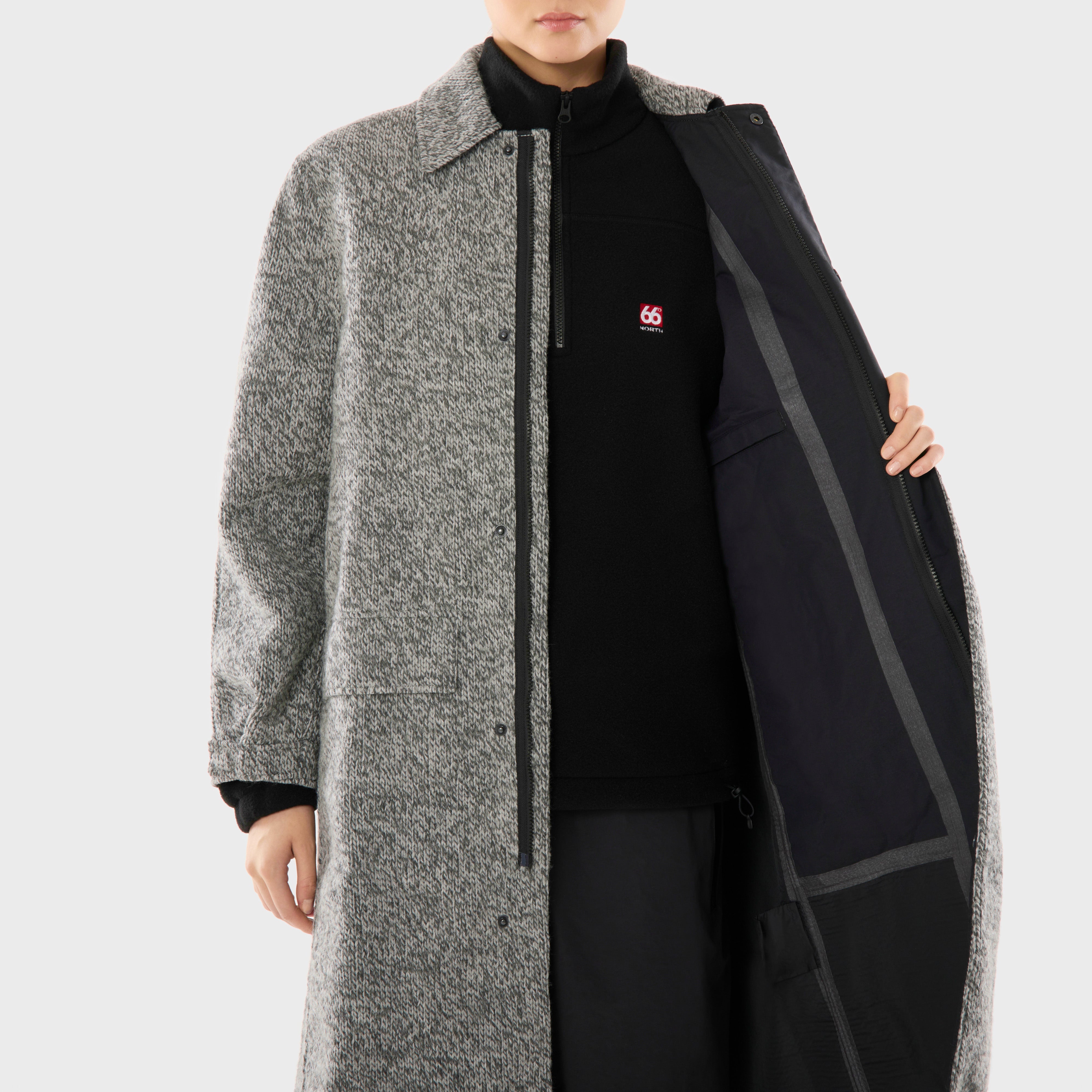 Technical and fashionable fleece-lined wool coat, with wind proof membrane.